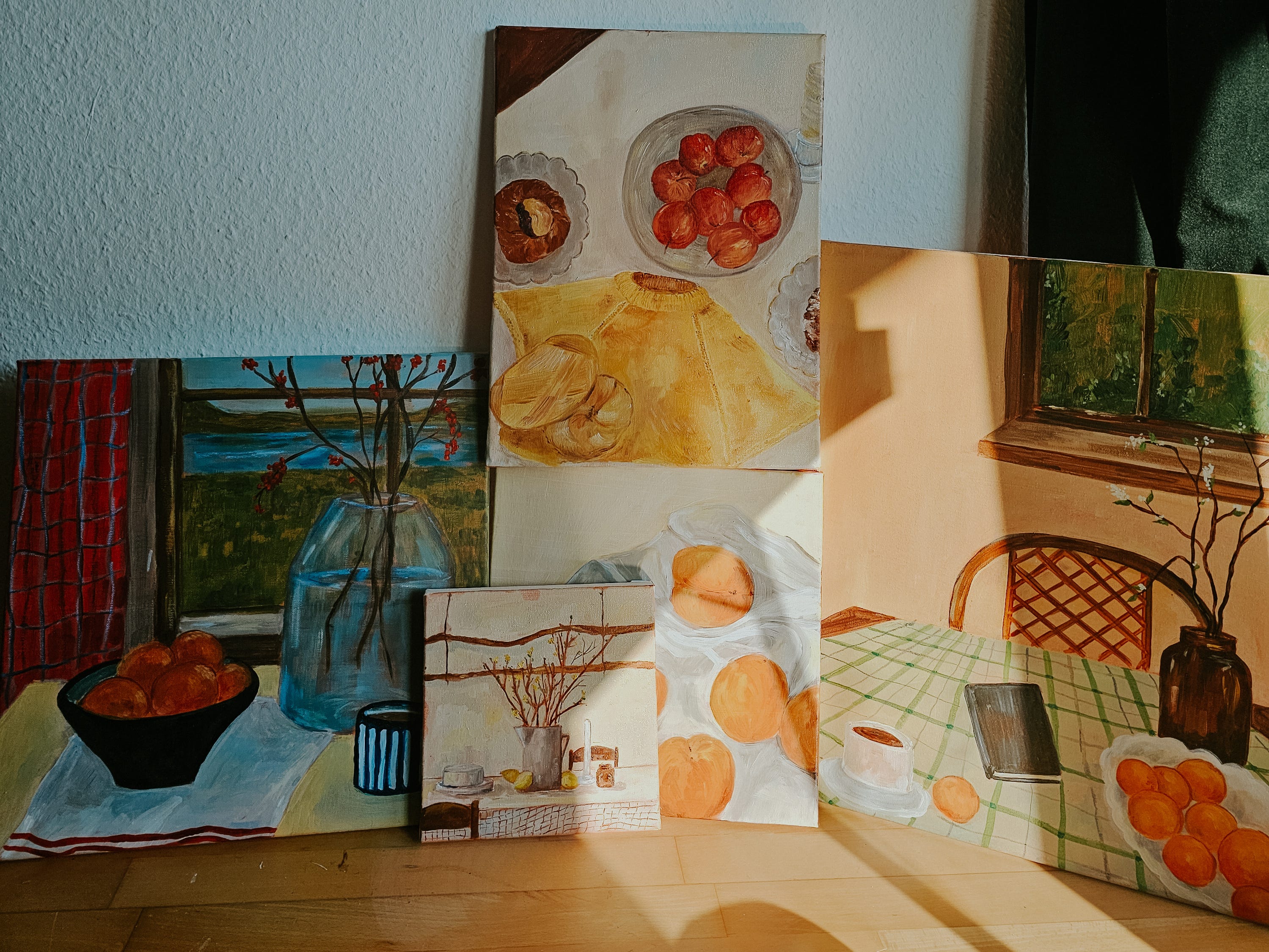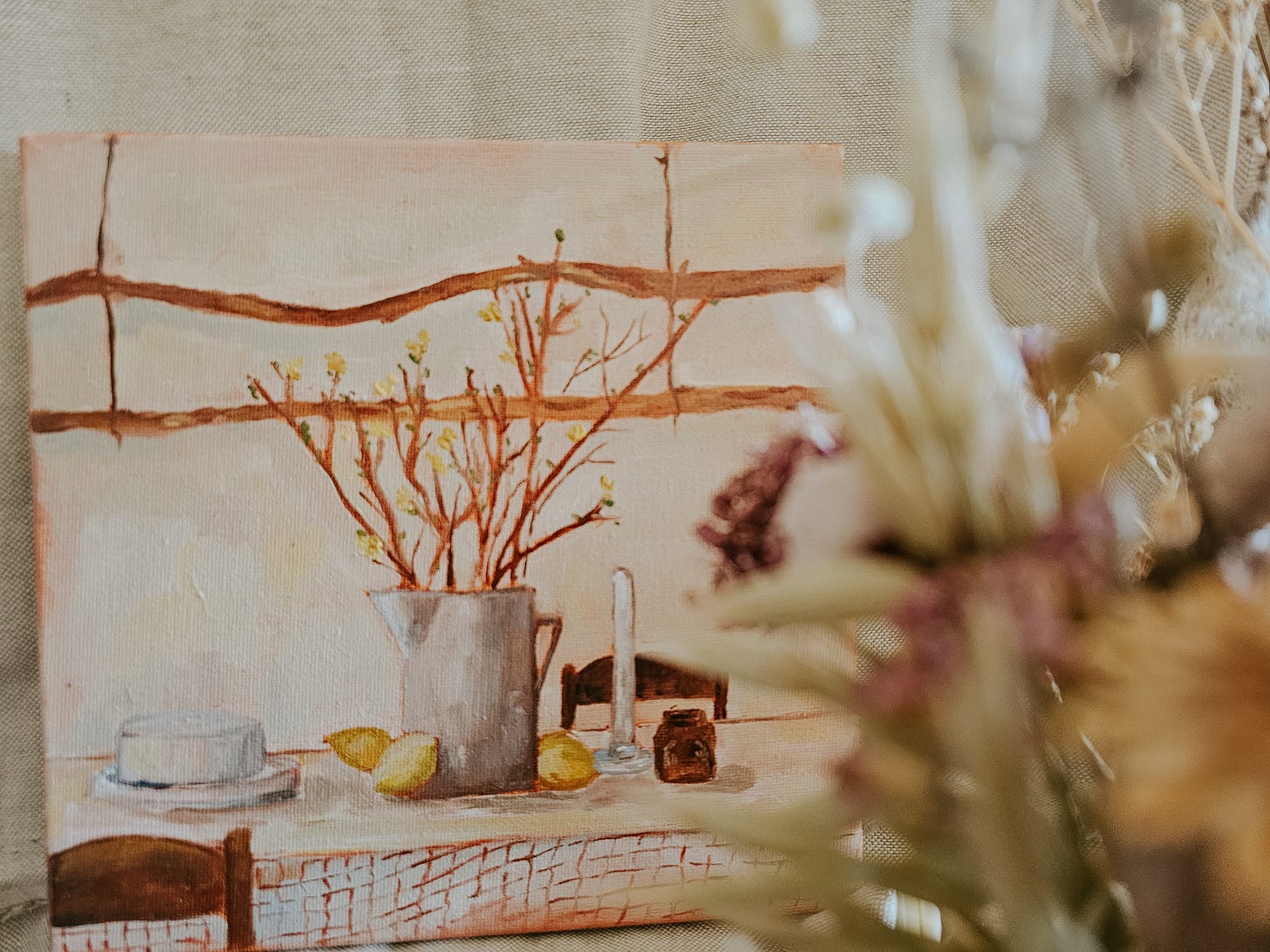 for her wonderful still-life session, which revived my creative energy. I was inspired by simply and cosy scenes from a home, a bit like last year during my “still-life table scene” collection.I love how a home is one of the most comforting places. There, we learn to find joy in the simple moments and pleasures of life. A sense of home represents safety, love and self-care; and I think this is why I love painting those scenes so much.